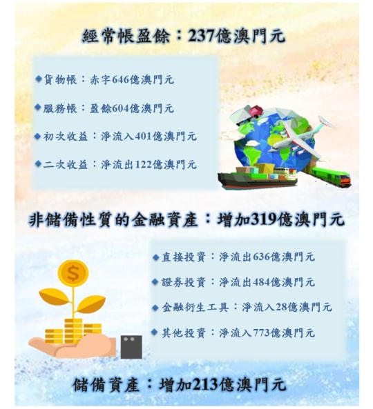 在2020年,澳門的整體國際收支初步錄得213億盈餘(澳門元,下同)。其中,經常帳錄得237億盈餘,而非儲備性質的金融資產淨值則增加了319億。