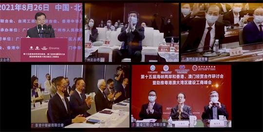 【本報訊】八月二十六日,由中華全國工商業聯合會、台灣工商企業聯合會、香港中華廠商聯合會、澳門中華總商會共同主辦的第十五屆海峽兩岸和香港、澳門經貿合作研討會暨助推粵港澳大灣區建設工商峰會召開。本次會議以「推進粵港澳大灣區科技創新合作,構建雙循環新發展格局」為主題,採用線下線上相結合形式舉辦,在北京、廣東、台灣、香港、澳門各設會場。全國政協副主席、全國工商聯主席高雲龍,台灣工商企業聯合會理事長許顯榮,香港中華廠商聯合會會長史立德,澳門中華總商會會長馬有禮,廣東省委常委、統戰部部長黃寧生出席會議並致辭。中央統戰部副部長,全國工商聯黨組書記、常務副主席徐樂江主持會議。