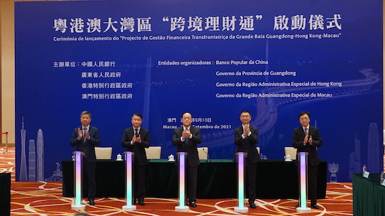 【本报讯】9月10日,中國人民銀行,廣東省人民政府,香港特別行政區政府與澳門特別行政區政府,在中国与葡语国家商贸合作服务平台通過共同視頻連線,舉行「粤港澳大湾区跨境理财通启动仪式」,国务院港澳办副主任黄柳权、中国人民银行副行长潘功胜、國務院港澳事務辦公室副主任黃柳權、广东省省长马兴瑞、香港特别行政区行政长官林郑月娥、澳门特别行政区行政长官贺一诚、中央人民政府駐澳門特別行政區聯絡辦公室副主任姚堅、澳門經濟財政司司長李偉農、澳門金融管理局行政管理委員會主席陳守信及委員黃立峰出席啟動儀式。