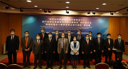 【本报讯】9月17日下午,澳门发展及质量研究所与国家材料腐蚀与防护科学数据中心、北京科技大学顺德研究生院联合建立联合实验室签约仪式及研讨活动在澳门科学馆举行。澳门大学葛伟副校长,澳门特别行政区政府环境保护局谭伟文局长,市政署市政管理委员会罗志坚副主席,建设发展办公室林炜浩主任,中国腐蚀与防护学会常务副秘书长程学群教授及澳门大学教授、业界资深工程师和澳门特区政府高级公务技术人员等参加签约仪式