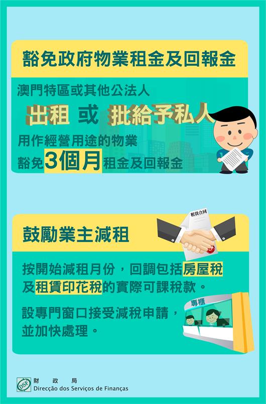 為減輕中小企的經營成本,澳門特區或其他公法人出租或批給予私人用作經營用途的物業,例如:出租經屋或社屋的商舖、設於公園、休憩區、文化設施等公共場所內的售賣亭、咖啡茶座、咖啡店、小食店、餐廳、單車場所、禮品店及自助飲品售賣機空間等,將獲豁免三個月租金及回報金。