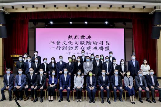 【本報訊】社文司司長歐陽瑜一行4拜訪民眾建澳聯盟,聽取和收集該會代表對社會文化範疇明年施政工作的意見和建議。民建聯主席施家倫、副主席宋碧琪、鍾建新,理事長李良汪等負責人接待,雙方展開討論交流。