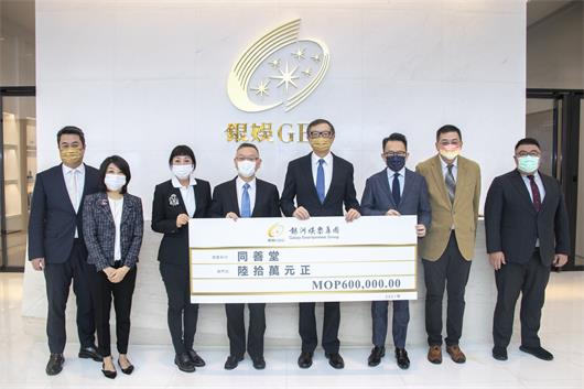 同善堂公佈自昨日起開展其「沿門勸捐」活動。為表示對活動的積極支持,銀娛副主席呂耀東先生及公共關係高級副總裁林志成先生等代表銀娛,向同善堂送交澳門幣60萬元善款支票,由其值理會主席崔世平先生、值理蔡明威先生、黃珮琳女士、林家偉先生、黃焯華先生及蕭婉儀女士代表接受。期間,雙方就各項慈善工作、企業社會責任以及常態化疫情防控舉措作交流。