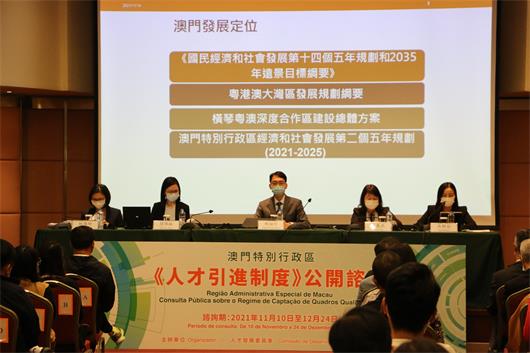 諮詢會上,周昶行秘書長介紹了構建《人才引進制度》的背景及目的,並由人才發展委員會秘書處人員簡介諮詢文本的主要內容。超過130名社團、相關專業團體及機構的代表出席了諮詢會,其中30名在會上就諮詢內容發表意見和建議,主要涉及引進的對象、限額的釐定、評審項目及評審機制等等。