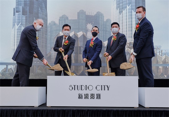 新濠主席兼行政總裁何猷龍、董事鍾玉文、首席顧問黃昇雄、首席營運總監(澳門業務)David Sisk及高級副總裁兼新濠影滙項目總經理Kevin Benning主持新濠影滙二期平頂儀式。