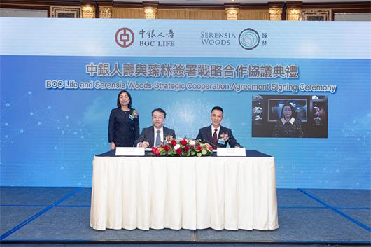 【本報訊】中銀集團人壽保險有限公司(“中銀人壽”)及澳門殷理基集團旗下的臻林大健康控股有限公司(“臻林”)於1月15日簽訂一項戰略合作協議,展開“橫琴粵澳深度合作區”首個跨粵、港、澳三地的“保險+康養”合作項目,同時亦是中銀人壽在“橫琴粵澳深度合作區”首個戰略合作項目,中銀人壽並成為臻林在粵港澳大灣區首個兼香港獨家人壽保險公司戰略合作夥伴。該協議在中國銀行(香港)副總裁龔楊恩慈女士及殷理基集團有限公司主席李佳鳴女士見證下,由中銀人壽執行總裁鄧子平先生及臻林主席兼創始人楊維聰先生簽署。