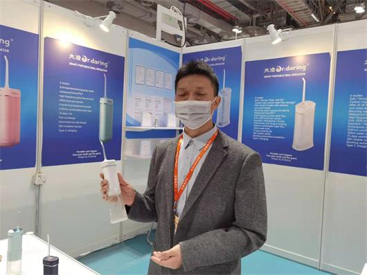 又例如,研發、生產、銷售一條龍的大凌(廣東)電子科技股份有限公司,這次就帶來了他們的產品,便攜式沖牙器。主要銷售市場在東歐、南美、北美地區,在內地與CCTV的中視購物、國美、抖音小店合作,雖然該公司擁有國內三大銷售平台,但仍然看準名優展平台優勢,故而在本屆的展會中實行了“只展不銷”的模式,希望通過名優展擴寬產品的宣傳推介面及力度,尋找更大合作商機。