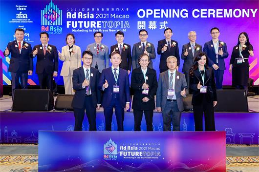 【本報訊】以“創樂園·享旅遊”為主題的二〇二一亞洲廣告會議(澳門大會)3日下午2時假澳門巴黎人宴會廳隆重開幕。中央人民政府駐澳門特別行政區聯絡辦公室副部長左祥华、大會主辦方亞洲廣告聯盟主席蘇雄、澳門貿易投資促進局主席劉偉明、澳門旅遊局代局長許耀明、澳門廣告商會主席黃義滿、澳門廣告商會理事長鍾靜儀、廣東省廣告協會會長陈钿隆、香港廣告業聯會會長高麗娟以及二〇二一亞洲廣告會議澳門大會主席畢志健出席本次開幕式。