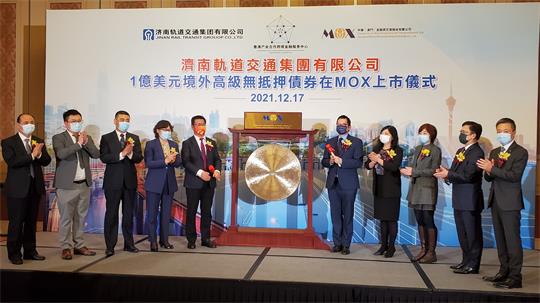 濟南軌道交通集團債券發行儀式於今(17)日假澳門喜來登酒店舉行,澳門貿易投資促進局執行委員余雨生,MOX執行董事兼副總裁阮天璕,濟南軌道交通集團有限公司黨委書記、董事長陳思斌,濟南融資擔保集團有限公司黨委書記、董事長兼魯澳產業合作跨境金融服務中心董事長王宏偉,澳門金融管理局金融發展廳副總監劉亞娟等嘉賓出席並主禮敲鑼儀式。