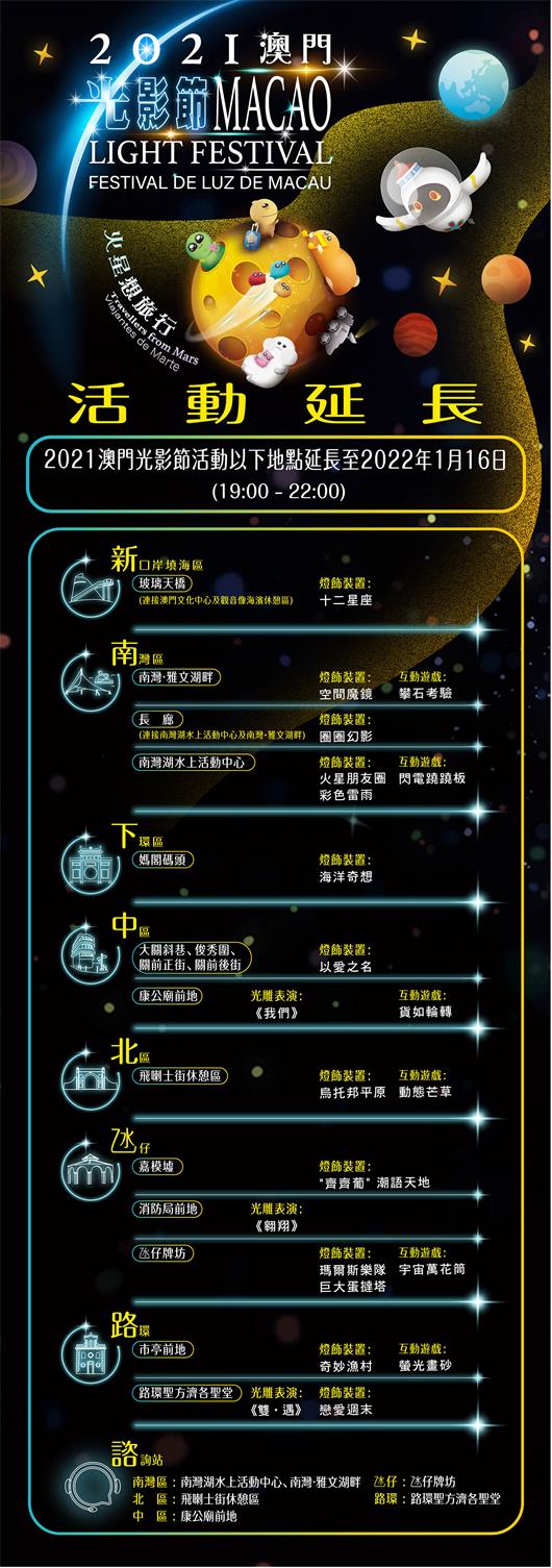 請參閱最新的“2021澳門光影節 ─ 火星想旅行”圖文包了解光雕表演、燈飾裝置及互動遊戲的具體延長安排。