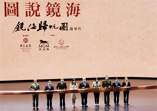 中國政協副主席何厚鏵;澳門特區行政長官代表、社會文化司司長歐陽瑜;中聯辦副主任嚴植嬋;外交部駐澳特派員公署特派員劉顯法;駐澳部隊政治工作部主任竇國杰大校;立法會主席高開賢;中銀澳門副行長葉兆佳;美高梅總裁、首席戰略及財務官馮小峰及故事片總策劃陸曦主禮《圖說鏡海——鏡海歸帆圖》首映禮。