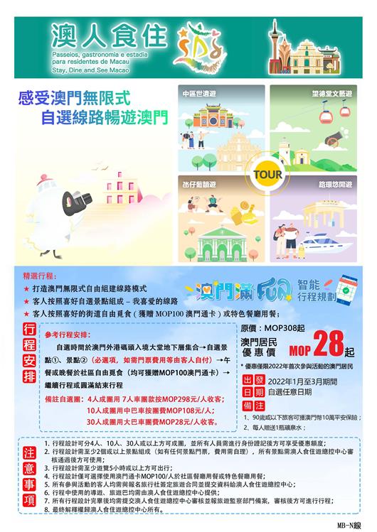 除了14條設定的路線,今年本地遊項目提供更大彈性,居民可與參加計劃的旅行社協商,自選“心水”景點/活動,使用“澳人食住遊”優惠度身訂造專屬的旅遊路線,感受澳門無限式。自選路線參團人數分為4人、10人及30人或以上,但須包括2個或以上旅遊景點,整個行程時間必須為5小時或以上,現階段可於1至3月任意選擇出發日期。與其他本地遊旅遊團一樣,自選路線團啟程前,團友須帶備澳門居民身份證及個人的綠色健康碼到指定地點-澳門外港碼頭入境大堂辦理登記手續。