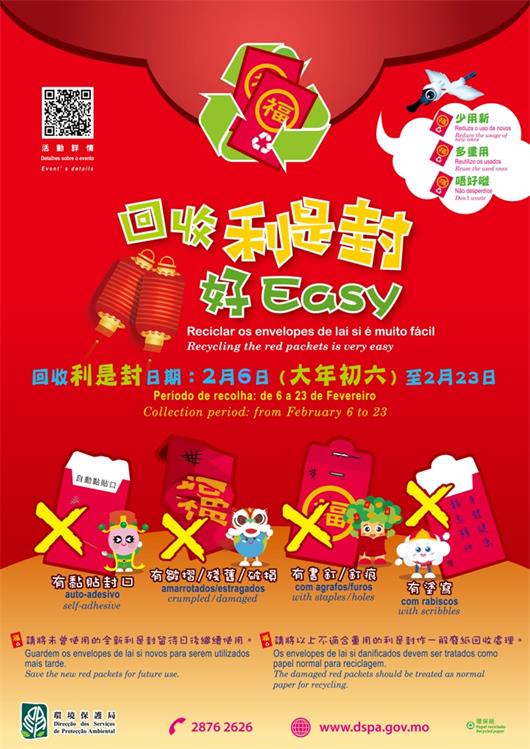 同時,為推動“源頭減廢”,環境保護局持續於新春期間舉辦回收利是封好EASY活動,宣傳「少用新、多重用、唔好嘥」的環保訊息。市民可於環境保護局、環保加Fun站、澳門街坊會聯合總會、澳門工會聯合總會、澳門婦女聯合總會、民眾建澳聯盟、澳門明愛、澳門中華新青年協會、澳門扶康會以及澳門社會民生促進會,共57個派發點索取重用利是封。同時,於2022年2月6日(大年初六)至23日期間,環境保護局將繼續與政府部門、社團、酒店、銀行、學校、商戶以及大廈等合作,設置利是封回收點,有關詳情敬請瀏覽本局網頁 http://www.dspa.gov.mo/redpacketrecycling.aspx。