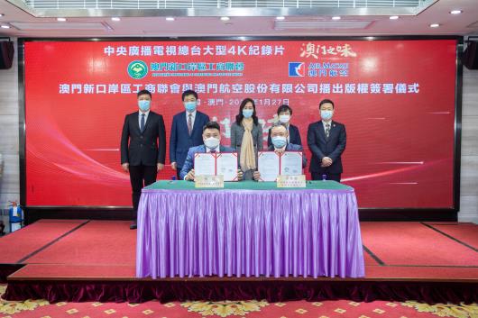 【本報訊】澳門新口岸區工商聯會與澳門航空股份有限公司於2022年1月27日在富豪海鮮酒家簽署大型4K紀錄片《澳門之味》的播出版權授權書。