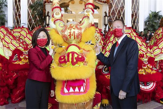 於大年初三(2月3日)及初四(2月4日),永利澳門有限公司副主席兼執行董事陳志玲及永利澳門有限公司總裁兼執行董事高哲恒率領一衆管理層成員主持金龍醒獅點睛儀式,寓意來年大展鴻圖、財源廣進,為喜氣盈盈的賀歲慶典揭開序幕。過百位金龍醒獅隊員隨著鑼鼓聲躍動起舞,並燃放炮竹賀歲,表演後朝氣蓬勃的龍獅隊伍在鼓聲下穿梭酒店內各大熱點,表演富傳統特色的採青絕技,為賓客帶來無限喜悅祝福。