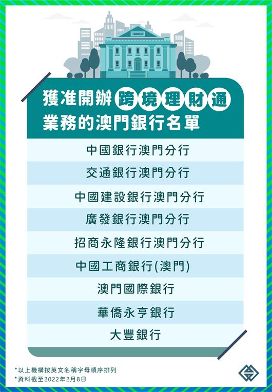 屆時,參與“跨境理財通”業務的澳門銀行共有9家,包括中國銀行股份有限公司澳門分行、交通銀行股份有限公司澳門分行、中國建設銀行股份有限公司澳門分行、廣發銀行股份有限公司澳門分行、招商永隆銀行有限公司澳門分行、中國工商銀行(澳門)股份有限公司、澳門國際銀行股份有限公司,大豐銀行股份有限公司,以及新獲批開展業務的華僑永亨銀行股份有限公司。相關銀行及其對應的內地合作銀行清單,已上載到金管局的“跨境理財通”專頁。