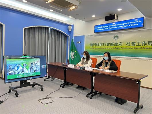 【本報訊】聯合國亞洲及太平洋經濟社會委員會於本月9至10日在總部泰國曼谷舉行聯合國婦女地位委員會亞太地區線上磋商會議,澳門特別行政區政府社會工作局家庭及社區服務廳廳長李麗萍、社區協作處處長林佩嫦以中國澳門代表身份參與。