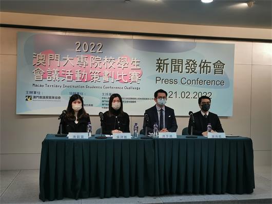 「2022澳門大專院校學生會議活動策劃比賽」新聞發佈會於2月21日下午在中土大廈19樓會議室舉辦。澳門會議展覽業協會青年委員會主任洪于德、副主任吳詩雅、謝兆宏、冼凱雯出席發佈會。