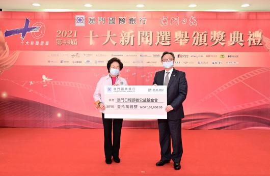 頒獎典禮上,首先由焦雲迪總經理代表澳門國際銀行向澳門日報讀者公益基金會送交10萬元善款支票,用於支持本澳慈善公益事業,由澳門日報讀者公益基金會會長賀定一代表接收。