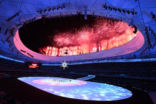 場地中央,燦爛的星海中,浮現過往12屆冬殘奧會舉辦城市名稱,最終定格在“2022北京”。代表冬殘奧會六大競賽項目的運動員們從一條雪道疾馳而下,滑入場內。場地中央出現一條冰壺賽道,隨著冰壺滑出,倒計時數字在場地內閃現:10、9、8、7、6、5、4、3、2、1……全場歡呼。