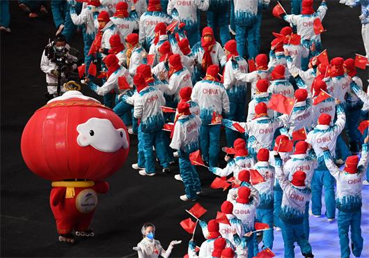 伴著《歌唱祖國》的旋律,東道主中國代表團最後入場。殘奧越野滑雪和冬季兩項運動員郭雨潔、殘奧冰球運動員汪之棟持鮮艶的五星紅旗,行進在隊伍最前列。本屆冬殘奧會中國代表團共217人,其中運動員96人,將參加全部6個大項、73個小項的角逐。這是中國參加冬殘奧會以來,代表團規模最大、運動員人數最多、參賽項目最全的一屆。