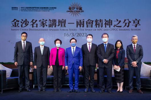 「金沙名家講壇-『兩會』精神之分享」是員工職業素養培訓系列活動之一,旨在讓團隊成員深入了解並把握國家發展帶來的機遇,助力推動澳門發展成為世界旅遊休閒中心。金沙中國一直致力透過不同形式及活動,包括舉辦職業素養培訓課程、專題講座、交流活動、電影分享會等大大小小超過20次活動,提升全公司26,000名團隊成員的職業素養水平。