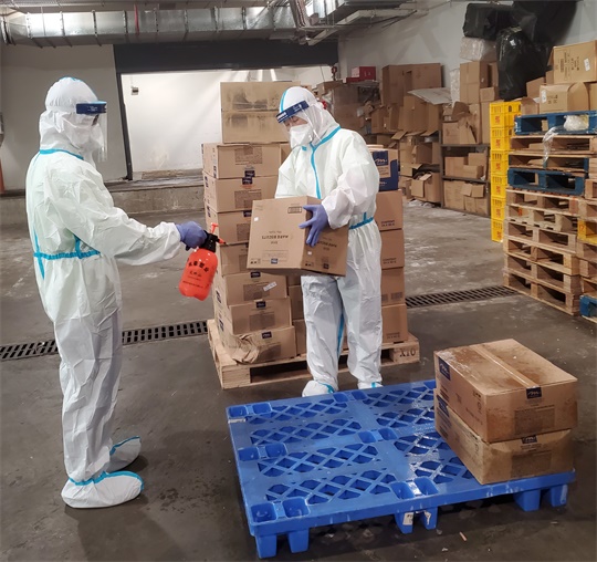 採訪媒體隨後去到位於石排灣的一個大型超級市場貨倉內了解業界對進口貨物的消毒入庫流程。身穿全身防護裝備的職員用消毒藥水為現場的貨物外包裝徹底消毒後,貼上“已完成消毒”標籤後再運至擺放位置。經濟及科技發展局牌照及稽查廳廳長鄺信昌在現場告訴記者,經科局本月初起已要求超市及供應業界在香港進口的貨品拆除板貨的保鮮膠膜後,需要進一步對貨物外包裝進行消毒,以降低新冠病毒經貨物傳播的風險。並於15日要求供應商及超市處理貨物人員每7天進行一次核酸檢測,以保障個人的健康。