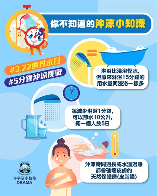 海事及水務局的節水推廣工作一直得到公眾支持,社會上已建立節水的普遍和基礎共識。局方希望透過更具體的行動目標,讓市民將節水意識貫徹到實際行動,於是藉“世界水日”推出“五分鐘沖涼挑戰”,號召市民在3.22世界水日,挑戰五分鐘內完成淋浴,同時大家亦可向身邊的家人朋友下“挑戰書”,共同響應節水號召的行列。