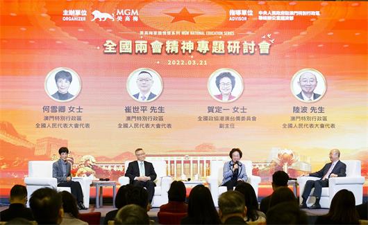 出席「美高梅家國情懷系列 ── 全國兩會精神專題研討會」的嘉賓包括中央人民政府駐澳門特別行政區聯絡辦公室經濟部處長孫耀華;美高梅中國控股有限公司聯席董事長及執行董事何超瓊;美高梅總裁、首席戰略及財務官馮小峰;總裁及首席營運官王志琪;以及人力資源執行副總裁余婉瑩。