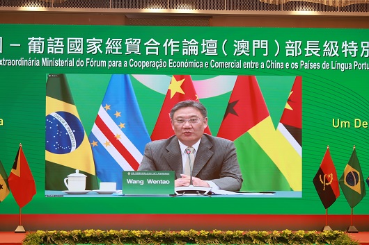 【本報訊】中國商務部部長王文濤在4月10日下午在澳門的中國與葡語國家商貿合作服務平台綜合體舉行“中國——葡語國家經貿合作論壇(澳門)部長級特別會議”開幕式北京——商務部會場致辭時表示,去年中國與葡語國家的貿易額比論壇成立之初增長近20倍,非金融類直接投資額增長50餘倍,澳門平台的作用進一步確實。另外,他又提出3點建議,一是深化抗疫合作,共建衛生健康共同體;二是拓展經貿合作,培育經濟發展的新動能;三是要用好澳門的平台,提升中葡合作論壇的新能級。