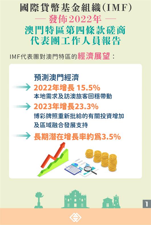 【本報訊】國際貨幣基金組織(IMF)總結2022年澳門特別行政區的第四條款磋商,並於今(13)日發佈代表團工作人員報告。代表團肯定澳門特區政府有效運用財政資源減輕疫情對經濟造成的負面影響,預測澳門今年經濟增長15.5%,明年經濟增長23.3%。