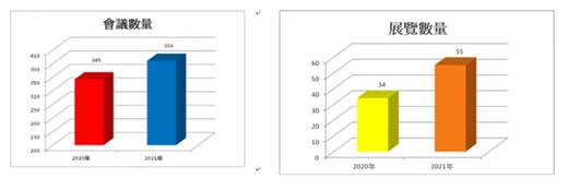 澳門統計暨普查局資料顯示,2021年全年澳門共舉辦449項會展活動,同比增加68項,當中會議386項,按年增加41項、展覽55項,按年增加21項,以及奬勵活動8項,按年增加6項;與會者(4.3萬人次)、入場觀眾(135.6萬人次)及參與人數(2,468人次)上升9.0%、55.0%及3.1倍。