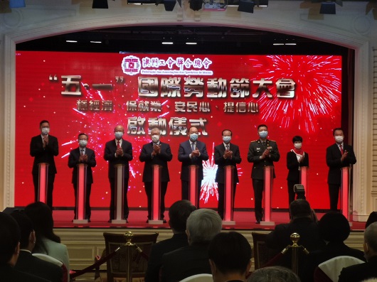 工聯今日舉行“五·一”國際勞動節大會”。行政長官賀一誠、全國政協副主席何厚鏵、中聯辦主任傅自應、外交公署特派員劉顯法、解放軍駐澳部隊參謀長趙建明大校、立法會主席高開賢等出席。