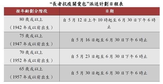 “長者抗疫關愛包”的派發期由5月12日上午10時起至6月30日下午6時止。基於防疫考慮,避免出現大量人群聚集及輪候情況,派發將按年齡分階段的方式進行。合資格的長者可按年齡分期於上述時間內前往任一派發服務點領取關愛包(請見附表),領取時須出示本人的澳門居民身份證正本,倘委托他人代領,代領人需出示合資格長者及其本人的澳門居民身份證正本。經在場工作人員輸入資料經核實後將獲發關愛包。