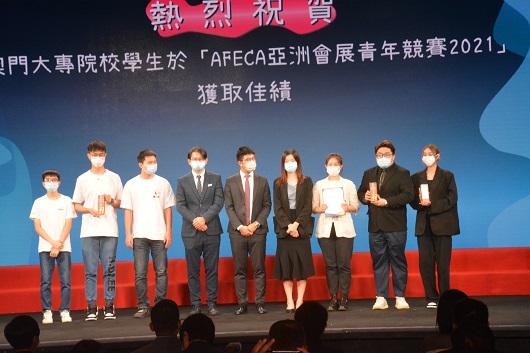 今日大會現場上,由澳門會議展覽業協會理事長潘耀榮等進行頒發入選決賽證書儀式, 同期也頒發2021 AFECA的亞洲會展青年競賽的獎座給去年代表澳門參賽獲獎的同學。