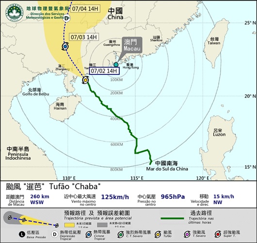 颱風“暹芭”集結在本澳西南偏西約260公里,正緩慢向西北方向移動,預料下午至傍晚於湛江至茂名一帶登陸。由於“暹芭”路徑較預期偏北,且移速較慢,對澳門的影響會在下午持續,因此八號風球將於下午維持。受“暹芭”雨帶影響,本澳今日間中有大驟雨及雷暴,吹7至8級東至東南風及有陣風。