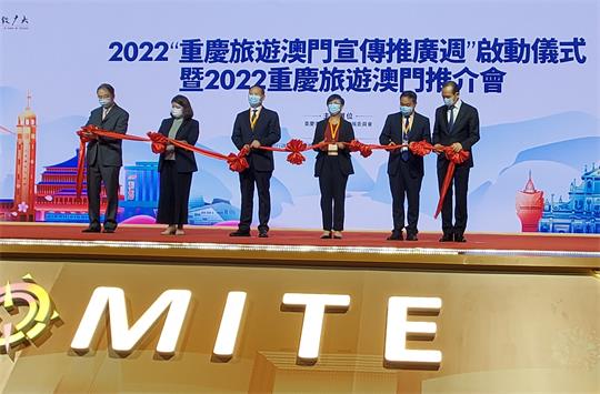 2022“重慶旅遊澳門宣傳推廣周”啟動儀式暨2022重慶旅遊澳門推介會在旅博會開幕首日下午在A館主舞台隆重舉行。澳門特區政府旅遊局局長文綺華、文化局代局長張麗珊,渝澳聯誼總會會長劉雅煌、重慶市文化和旅遊發展委員會副主任秦定波、武隆區人民政府常務副區長劉高永主持啟動儀式,澳門29家涉旅企業代表、學術機構代表,以及中外各地展商代表近120人受邀出席,並通過澳門媒體直播的方式,吸引近5萬澳門人線上參與互動交流。