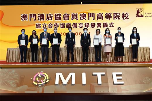 簽署儀式於當日昨下午三時二十分假博覽會主舞台舉行。旅遊局長文綺華、中聯辦教育與青年工作部副處長徐之平、教青局高教廳廳長許嘉路、澳門大學工商管理學院綜合度假村及旅遊管理學系系主任苗莉、理工大學副校長李雁蓮、旅遊學院院長黃竹君、科技大學酒店與旅遊管理學院院長吳國民、聖若瑟大學商學及法律學院院長劉鈺馨、城市大學國際旅遊與管理學院執行副院長李璽、澳門酒店協會會長王淑欣及理事長路易斯· 埃雷迪亞(Luis Heredia)等出席。