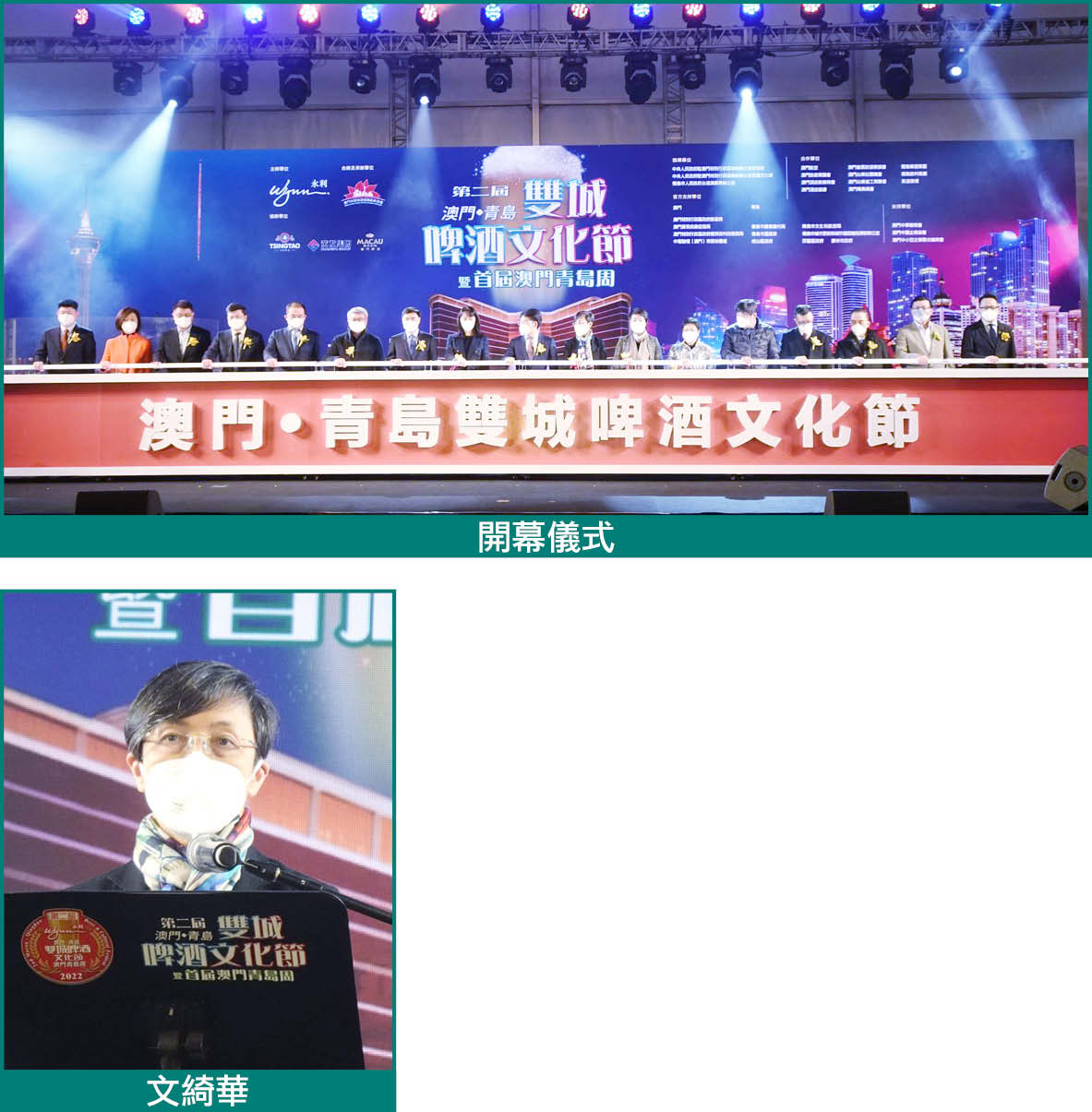 【本報訊】“第二屆澳門青島雙城啤酒文化節暨首屆澳門青島周”載譽歸來。12月12日晚假永利皇宮舉辦開幕儀式“第二屆澳門青島雙城啤酒文化節暨首屆澳門青島周”由永利渡假村(澳門)股份有限公司主辦,澳門休閒旅遊服務創新協會合辦及承辦,青島啤酒股份有限公司、青島黄島發展(集團)有限公司及澳門啤酒有限公司協辦。本屆啤酒文化節於12月9日至31日在水利皇宮南門戶外草地舉行,為期23天。旅遊局局長文綺華表示,藉著“第二屆澳門青島雙城啤酒文化節暨首屆澳門青島周”活動,增強兩地間的交流,繼續發揮青島——澳門雙城的獨特優勢。這次活動向澳門居民和旅客展示雙城“旅遊+文化”和“旅遊+美食”的魅力,帶動全城歡樂氣氛。