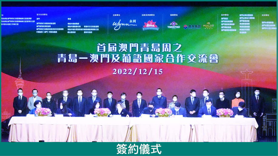 【本報訊】“首屆澳門青島周”及“葡語系國家產品展示周”與啤酒文化節同場舉行,並於12月15日下午在永利皇宮宴會廳舉辦“青島一澳門及葡語國家合作交流會”旨在結合青島、澳門及葡語國家企業家共同交流,探討合作發展等機遇。“首屆澳門青島周”由青島市委台港澳事務辦公室牵頭,近20個青島政府部門、區市及企業作爲活動的支持與合作單位,組織了20多家青島品牌企業集團、名優農產品企業等參與。交流會上,除了企業產品介紹及商業配對外,亦進行了7項簽約儀式。