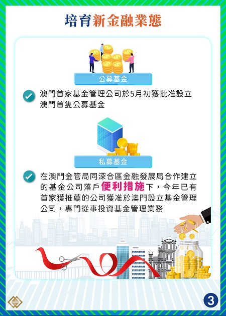 隨著財富管理業務相關的法律法規逐步優化,今年公募基金和私募基金業務領域均取得新的發展。澳門首家基金管理公司於本月初獲批准設立澳門首隻公募基金。基金的管理規章已進行公示。私募方面,在澳門金管局與深合區金融發展局合作建立的基金公司落戶便利措施下,今年已有首家獲推薦的公司獲准於澳門設立基金管理公司,以專門從事投資基金管理業務。