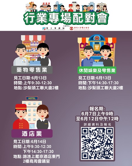 6月13日上午藥物零售業配對會及下午休閒娛樂及零售業配對會在澳門工會聯合總會二樓(沙梨頭海邊街2-6號工聯大廈)舉行;6月14日酒店業配對會在澳門上葡京二樓商周會議室舉行。報名日期為6月7日上午9時至6月12日中午12時。