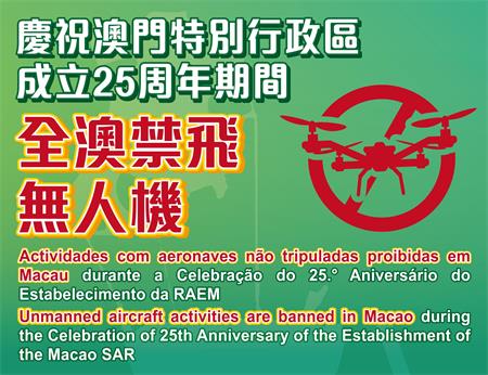 根據第43/2021號行政命令核准之《澳門空中航行規章》第66條的規定,民航局將於20241214日至22日期間實施全澳禁飛無人機,以確保澳門特別行政區成立25周年慶祝活動的順利和安全進行。