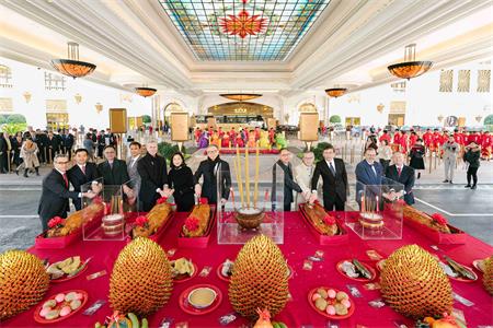 在傳統拜神儀式上,呂耀東攜管理層成員,包括:董事程裕昇、人力資源及行政集團董事呂慧玲、首席營運總監—澳門祁嘉杰、法律部高級董事郭敏生、博彩部高級董事樂啟誠、項目發展部董事丁廣沅、綜合娛樂服務部董事李健汶等,依次在星際酒店正門及“澳門銀河”鑽石大堂外恭敬祈福,祈願新的一年風調雨順、祥和興旺。隨後,伴隨着鑼鼓聲聲和爆竹隆隆,數隻代表吉祥寓意的雄獅生猛活潑地舞動,整個現場歡騰鼓舞,吸引了眾多遊客駐足觀賞,共同感受這份喜悅。