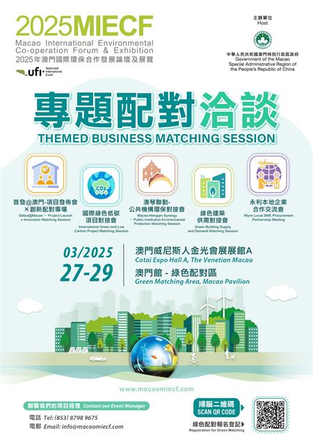 有意參加綠色配對的客商可透過掃瞄附圖海報中的二維碼,或登錄https://www.macaomiecf.com/miecf2025/event/green-matching預先登記。大會將根據客商提供的配對需求,匹配合適的合作夥伴,安排現場洽談。