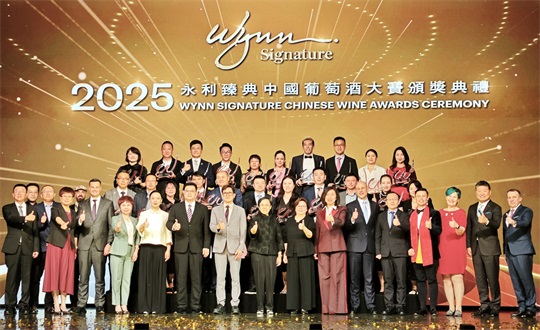 【本報訊】由澳門特別行政區政府旅遊局支持、永利渡假村旗下精緻體驗品牌“Wynn Signature永利臻典”傾力打造的“2025永利臻典——中國葡萄酒大賽”頒獎典禮於4月11日晚盛大舉行。來自全球各地的逾200位葡萄酒專家、中國酒莊代表、業界人士、國際媒體和葡萄酒愛好者共襄盛舉,到場見證了象徵中國葡萄酒最高榮譽的各項年度大獎逐一揭曉及榮耀加冕。永利隨即啟動了得獎佳釀的全球推廣計劃,以旗下星光閃耀的頂級餐廳陣容及強大的全球資源網絡,全力賦能中國精品葡萄酒在全球範圍內的市場拓展及品牌傳播。