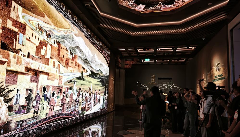 展館內,“瀚海西風”、“星漢燦爛”、“和光同塵”和“大道錦程”四大主題單元系統呈現陸上絲綢之路的交流歷史、融合成果與未來願景。第一單元“瀚海西風”追溯古絲綢之路開拓者們通過貨物交換與資訊流通,逐步構築絲綢之路千年不衰的基礎;第二單元“星漢燦爛”展示以絲織、陶瓷、漆器、金工、玻璃、琺瑯為代表的技術沿絲路東西傳播,並最終顯現於人們衣食住行的生活萬象;第三單元“和光同塵”呈現絲綢之路上交融的精神成果,透過圖像、雕塑、音樂中的審美藝韻、經卷、典籍中的哲學思辨,昭示著絲綢之路在促進人類深層對話上的深刻作用;第四單元“大道錦程”則是闡釋絲路的物質與精神遺產如何豐富當下的藝術創作,並服務於國家互信、貿易互聯、民心互通的人類命運共同體構建。
