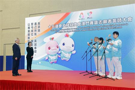授旗儀式暨誓師大會在望廈體育中心舉行。岑浩輝向參與十五運會及殘特奧會的澳門體育代表團授旗,以及為澳門賽區志願者監誓。