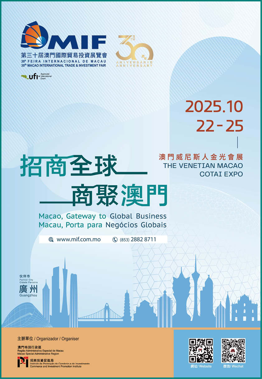 此外,第30屆MIF將與“第二屆中國—葡語國家經貿博覽會(澳門)”、“澳門國際品牌連鎖加盟展2025”及“粵港澳大灣區人才高質量發展大會”同期同場舉行,數展聯動實現資源疊加與效益最大化。如欲了解MIF最新資訊,可瀏覽大會網站:www.mif.com.mo,或致電(853)2882 8711,亦歡迎關注微信號:MICE_IPIM。