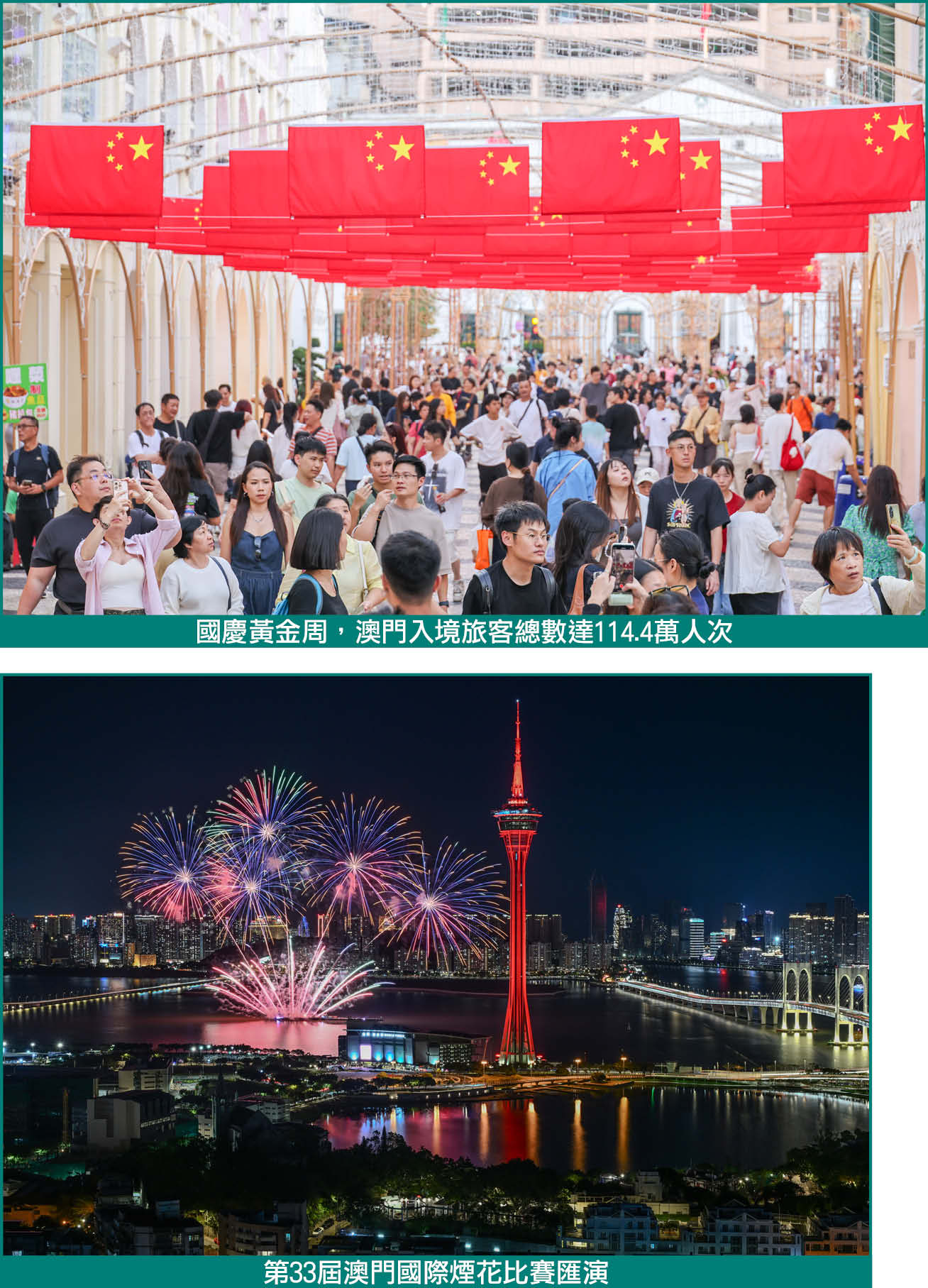 另一項靚麗的數字是,本澳今年黃金周酒店入住率逾九成,旅客總量更比去年提早40天突破3,000萬人次,其成功肯定離不開善用“IP經濟”、社區營造與琴澳聯動。特區政府透過設立臨時行人專區、引入Sanrio與POP MART等IP裝置、舉辦動漫遊戲展等,成功將旅客引入舊城區,激活社區經濟。澳門向深度、廣度拓展旅遊業的戰略,在假期的考驗下逐見成效。